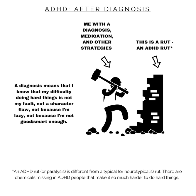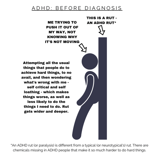 One of the best things we can do for helping overcome chronic ADHD paralysis is getting a diagnosis. A diagnosis shifted my perception of the difficulty I had taking action, from one of self criticism and self loathing, to accepting that there is a good reason for my struggle. A reason based on the neurobiology of my brain.